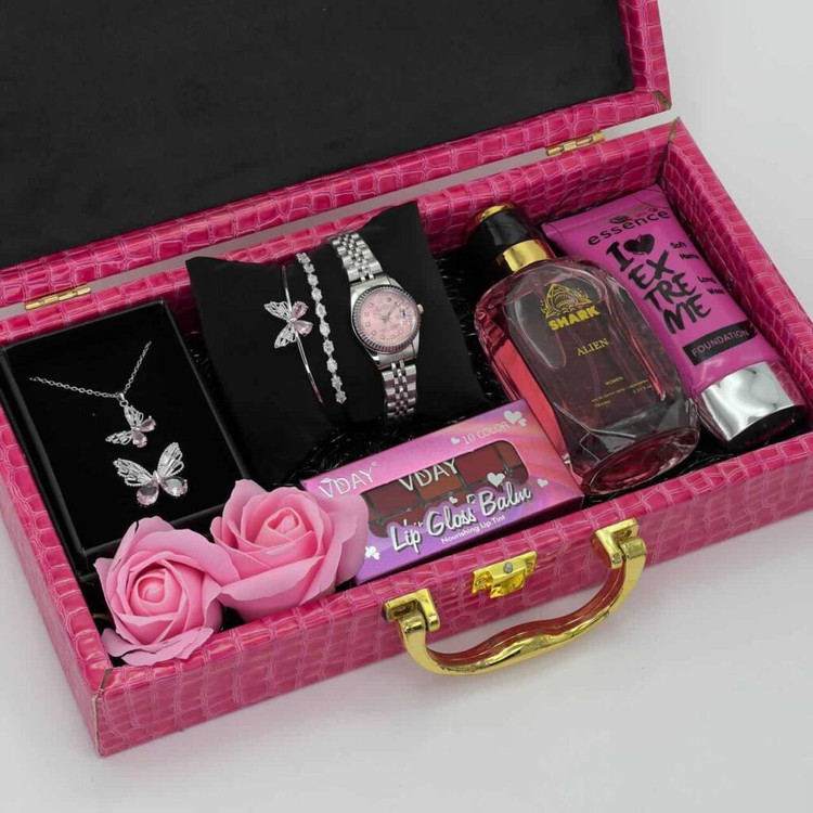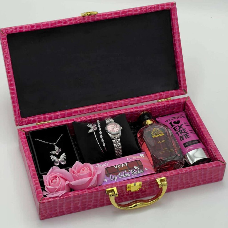 جعبه لوکس ساعت رولکس دستبند گردنبند انگشتر فرری سایز ادکلن 80 میل با کیفیت کرم پودر اسنس پالت رژ 10 رنگ رز معطر
