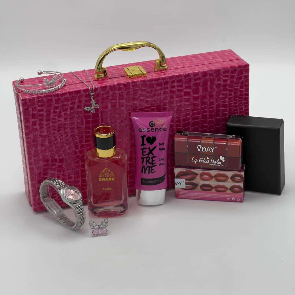 جعبه لوکس ساعت رولکس دستبند گردنبند انگشتر فرری سایز ادکلن 80 میل با کیفیت کرم پودر اسنس پالت رژ 10 رنگ رز معطر